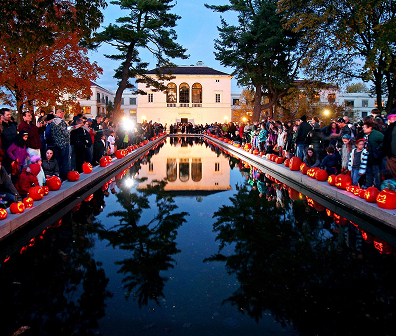 Each autumn, the Morris County community gathers at Vail Mansion Plaza for Pumpkin Illumination. Attendees are invited to come in costume and to bring a carved pumpkin to place around the reflecting pool. We provide electric tea lights to place inside each jack-o-lantern, creating a dazzling display that reflects off the water as the sun sets.