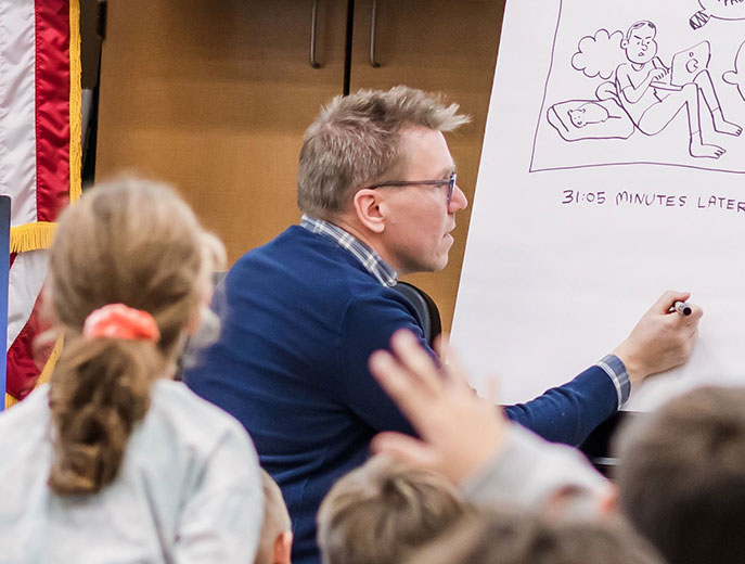 A series of hands-on creative drawing sessions, led by award winning cartoonist and author Mike Dawson, designed to be paired or presented separately from Mike’s “Cartooning Lessons” assembly. Students work out of an original workbook filled with comic-making exercises. They learn the difference between drawing and cartooning, and gain confidence using the language of comics to tell their own stories. At the end of the sessions, students have created their own comic filled with their drawings and cartoons that they are able to keep and take home with them.